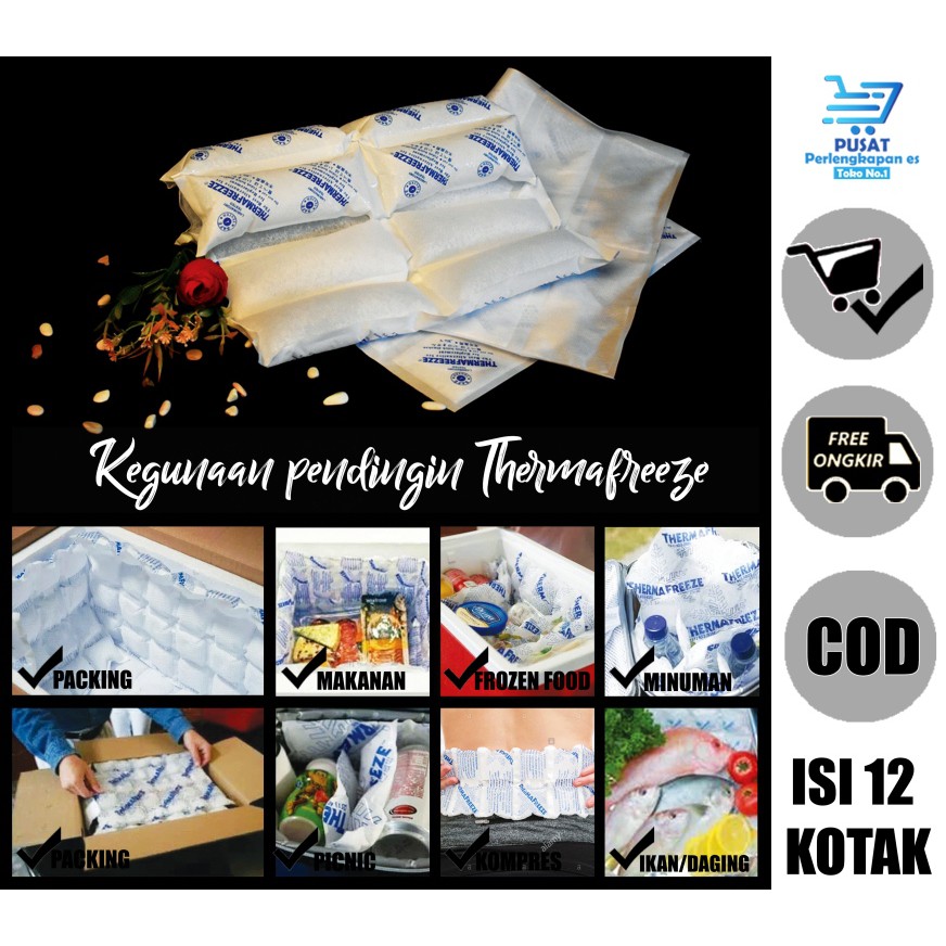 cooler cooler box pendingin pendingin air thermafreeze thermafreeze ice pack thermafreeze ice gel ice gel thermafreezeice pack lembaran THERMAFREEZE Merek : Thermafreezze Ukuran/lembar : 39 x 28 cmIsi per lembar : 12 piecePer Piece : 12.5 cm x 6.5Cm Setelah dicelup air ketebalan : + 3 s/d 4 Cm Total berat 1 lembar jika dicelup air : +/- 1100 gramBatas Penggunaan : 10x pemakaianDapat Dipotong jadi 12 bagian.Inovasi pengganti es batu yang terbaru.Thermafreeze atau Ice Gel Lembaran ini dapat digunakan untuk mengirim parcel/makanan lewat kurir/ekapedisi, menyimpan makanan/minuman agar tetap dingin, atau bahkan untuk memberikan bantuan penanganan cedera olahraga dll.Setiap lembar Ice Gel Lembaran ini berisi 12 sel dan dapat dipotong menjadi 12 bagian kecil.Thermafreeze yang telah dibekukan akan bersifat fleksibel, ringan dan tidak menetes, sehingga tidak ada kekhawatiran barang/produk kita akan rusak selama transit atau pengiriman.Cara penggunaan:(1) Rendam lembaran ice pack didalam air selama 10-15 menit(2) Tiriskan setelah mengembang(3) Bekukan selama 18 - 24 jam (dlm posisi plastik di sebelah bawah) Bisa lebih cepat bekunya (tergantung freezernya)(4) Ice Pack telah siap digunakanThermaFreezeApa yang membuatnya lebih menguntungkan ?1. Harga Yang murah / terjangkau2. dapat digunakan berulang ulang3. ringan dan fleksibel4. Tidak mengeluarkan air sehingga menjaga produk andaBiasa digunakan untuk :/ Frozenfood/ Kompres Cedera/ Distribusi Sayur/ Distribusi Daging/ Distribusi Seafood/ Distribusi Buah Buahan/ Distribusi Farmasi/ Ikan Laut / Segar#cooler #coolerboxpendingin #pendinginair #thermafreeze #thermafreezeicepack #thermafreeze #icegel #icegelthermafreeze #icepacklemba