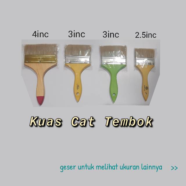 ( Foto produk asli )Kuas cat tembok/dinding dengan berbagai ukuran,- 4inc- 3inc, tersedia warna hijau dan kuning- 2.5inc- 2inc- 1.5inc- 1inc+ Jika ingin membeli beberapa macam varian namun bingung cara ordernya. Silahkan chat kami saja dan kami akan mengirimkan video tutorial yang kami buat lewat whatsapp. Atau tinggal tulis saja jenis produk yang diinginkan di catatan. Selamat berbelanja~!NOTES : Sebelum membeli lebih baik tanyakan dulu apakah barang yang akan diorder ready atau tidak. Karena, kami juga memiliki toko offline jadi tidak bisa memperkirakan stock yang tersedia. #kuascatmurah #kuascatte