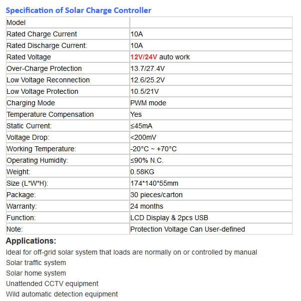 GARANSI SERVICE 2 BULAN (Segel garansi service tidak boleh rusak), diluar harga penggantian sparepartUSB bisa charge Ipad/tablet/smartphone, karena arus outputnya max 3A, product sejenis ada yang hanya 500mA yang tidak bisa dipakai untuk charge smartphone/tablet./ipad.out usb 5v 3A tidak akan membuat battery cepat rusak, hal ini tergantung pada rangkaian charger di device anda, umumnya ada autocutoff yaitu berhenti charging saat battery sdh penuh, jadi hal ini sangat aman. Charging pada devise akan meningkatkan volt battery dgn volt yang sdh diatur oleh pabrik sehingga ampere yang masuk ke battery bukan 3A per jam, tapi sesuai kebutuhan yang sdh di setting oleh pabrik smartphone anda.Perhatikan petunjuk pemasangan. kekeliruan cara pasang menyebabkan controller terbakar. pemasangan harus Aki dulu pertama kali dan tidak boleh asal nempel harus kuat dan tidak mudah terlepas, ketika panel disambung dan charging terjadi aki tidak boleh terlepas 1 detik pun. jangan memasang saklar, mcb atau fuse pada kabel kontroller ke aki.load hanya untuk lampu-lampu atau alat-alat kecil, bukan inverter, inverter harus disambung langsung ke aki. Penyambungan inverter, pompa atau alat berat lainnya dapat merusak permanent yang tidak dapat diservice)USB charge sdh ditest bisa charge ipad, iphone. Luar biasa, tidak seperti product lain yang hanya 500ma, ini claimed 3A. 1,5A per USB ada 2.PWM series battery charging (not shunt)3-position battery select: gel, sealed or floodedAuto swith on and off load. Cocok untuk PJu.Very accurate control and measurementJumper to eliminate telecom noiseParallel for up to 300 ampsTemperature compensationVery low voltage dropsCurrent compensated low voltage disconnect (LVD)With full controller protectionPerlu diingat:1. Jangan melepas aki saat charging berlangsung. Sama artinya pasang aki dulu baru panel.2. Jangan terbalik memasang +/- nya.3. Jangan menggunakan panel melebihi maximal, atau menggunaka aki yang sudah soak (dibawah 1 barang tersedia boss , langsung dipesan , akan segera kami p
