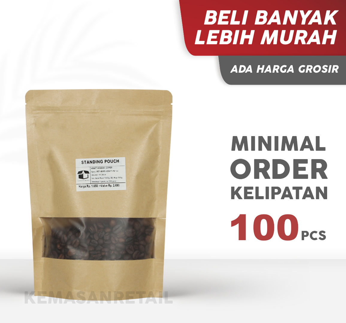 MOHON DI PERHATIKAN: - Minimum order: Kelipatan 100 pcs (1 pack)- Barang yang sudah di beli tidak dapat di kembalikan atau ditukar. - Mohon pastikan terlebih dahulu ukuran yang anda pilih.Spesifikasi Produk:Jenis = Stand Up Pouch / Standing PouchIsi = 100 pcs/packSpec: PET/BOPP/KRAFT/PEKetebalan: 120ยต (microns)Food Grade materials.Tersedia berbagai jenis ukuran:- 12cm x 20cm (untuk acuan gula pasir 150g, acuan kopi 100g)- 14cm x 20cm (untuk acuan gula pasir 250g, acuan kopi 150g)- 15cm x 22cm (untuk acuan gula pasir 500g, acuan kopi 250g)- 16cm x 25cm (untuk acuan gula pasir 700g, acuan kopi 300g)- 18cm x 26cm (untuk acuan gula pasir 1000g, acuan kopi 500g)- 20cm x 30cm (untuk acuan gula pasir 2000g, acuan kopi 1000g)Kemasan Stand Up Pouch Kraft Window merupakan kemasan yang dapat berdiri dandilengkapi jendela untuk memudahkan melihat produk. Dilengkapi pula denganZipper/Klip/Ziplock sehingga produk mudah untuk di buka atau di tutup. Disertai “tear notch” segitiga kecil utk memudahkan anda menyobek kemasan.Produk ini tebal dan tidak murahan, kemasan Ecopack lebih mudah untuk terurai,dan dapat melindungi produk anda dari Sinar, Kelembaban, Udara dan Benturan. Stand Up Pouch ini sangat cocok untuk produk seperti keripik, kacang, snack,biji-bijian, Minuman serbuk, Bubuk, utk bahan chemical, produk fashion,aksesoris, dan lainnya. Kami juga menerima JASA PENGEMASAN (Co-Packer), didukung dengan mesin-mesinautomatic berkualitas terbaik dikelasnya.Terima kasih telah berbelanja di toko kami. ^^ Just DO IT & DO the Bes
