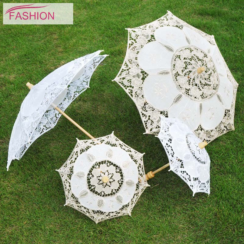 Features:Material:LaceDimensions:Length:26cm/Diameter:29cm, Length:43cm/Diameter:45cmUse: Bridal decoration umbrellaColor:White, beigeProcess : HandmadeEasy folding umbrella for shade.Straight handle.It's beautiful for stage performance,and also a good gift for friends.Delicate, Sweet, Romantic- sauntering is more the pace, strolling through a garden, lounging by the pool, relaxing seaside.You can savor every minute of summer. includes1x Umb